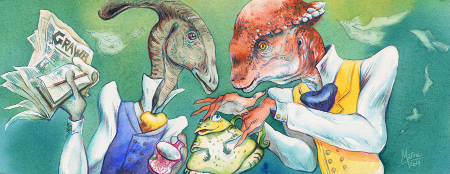 Voici la première surprise estivale : nous avons collaboré avec l’artiste-illustratrice Marine Tumelaire pour la création de la bannière que vous pouvez retrouver sur nos différents réseaux sociaux. La thématique était la suivante « Deux dinos aristos papotent en prenant le thé », le courant est tout de suite bien passé. On a donc partagé un bon moment autour de ce projet. Voyez-vous même !